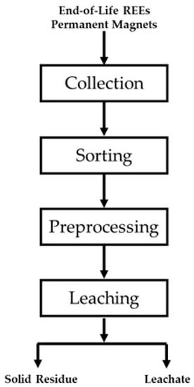 The current work is focused on the literature review regarding the hydrometallurgical REE recovery from REE permanent magnets, especially in the preprocessing and leaching steps. Thus, the proposed hydrometallurgical route is based on the following main steps: collection, sorting, preprocessing, and leaching (Figure 2).