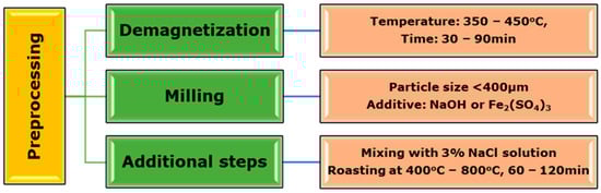Hence, selecting the proper preprocessing is of high importance to avoid extreme conditions and the case of ignition [58]. Within the available literature, the extreme corrosion of magnets and the possibility of ignition are not extensively mentioned. The main steps of the preprocessing are focused on the demagnetization of magnets and the milling to obtain a nonmagnetic powder. In some research studies, additional preprocessing steps were attempted to improve and simplify the leaching step to follow (Figure 3).