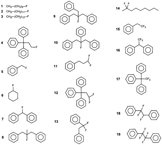 that now comprises the groups Fterminal, CH2, CH2, and CH3. Note that whereas in the first case all CH2 were equivalent, in the second case, CH2 ≠ CH2 ≠ CH2. Thus, we would need to introduce two further GC parameters. However, for multiple substituted fluoroalkanes, further parameters will be required, and not only for the CH2 but also for the CH and the C group. Whereas this is possible on paper, in practice, we do not have the experimental data to develop this further. Finally, we have now been talking about the fluoroalkanes only, but the same applies to structures involving affected carbon atoms in phenyl rings such as in structures 5, 7, 10, 13, 18, and 19.3.3. Benzylhalides