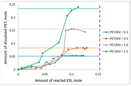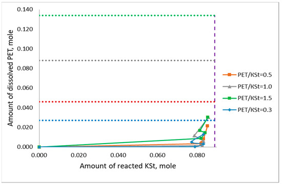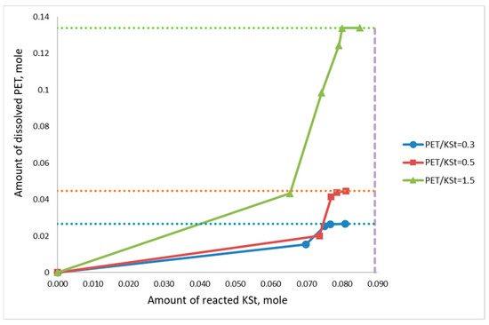 Waste PET dissolves in ethylene glycol for different initial molar ratios of PET/KSt at 190 °C. Horizontal lines are total amounts of PET; vertical lines are total amounts of KSt.