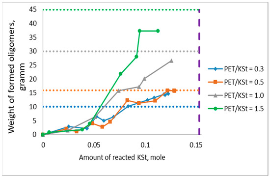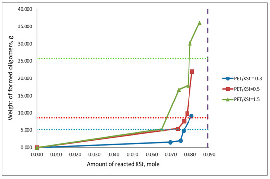 There is a correlation between the weight of the obtained oligomers and the weight of PET dissolved in pure glycerol for different initial molar ratios of PET/KSt at 170 °C. Horizontal lines are total amounts of PET; vertical lines are total amounts of KSt.