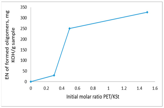 The change in the ether number of the formed oligomers after 300 min of the PET depolymerization by KSt in ethylene glycol at 170 °C and a different PET/KSt ratio.
