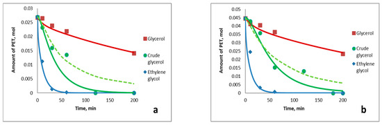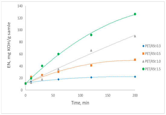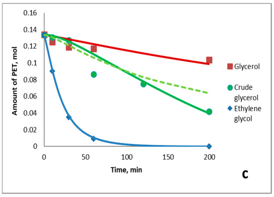 Fatty acid ethylene glycol esters (FAEGEs) are a by-product of PET saponification by potassium soaps that remain in the liquid mixture after product separation, leading to an increase in ester number (Figure 8). At first, the EN of crude glycerol is 11 mg KOH/g. Its value is determined by the content of FAMEs. At the low PET/KSt initial molar ratio (0.3), PET dissolution proceeds rather quickly with the formation of mainly dipotassium terephthalate [19], as a result of which no liquid oligomers remain in the reaction mass and the increase in the ether number is due only to the accumulation of FAEGEs. The amount of FAEGEs formed increases as the PET/KSt initial molar ratio of 1.5 increases. At the same time, several PET fragments remain in the liquid phase in the form of liquid oligomers. Therefore, it leads to EN increasing up to 126 mg KOH/g. The presence of FAEGEs in the reaction mixture confirms the theory of their transesterification with glycerol with the formation of ethylene glycol, which we proposed in our early work [21]. The increase in the initial amount of PET leads to the accumulation of ethylene glycol, which is a highly effective PET depolymerizing agent, so PET glycolysis cannot be ignored in the kinetic model.