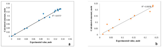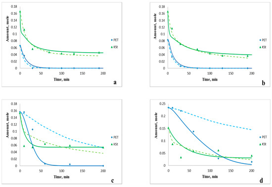 As a result of the optimization, a mathematical description of the kinetics of the PET depolymerization was obtained (Figure 10a–c and Figure 11a–d). At the same time, a novel model presented a better description of the process, which can be proved by the accuracy of the approximation (R2) for the correlation of experimental and calculated values of the amounts of PET and total determined potassium ions according to typical curves presented in Figure 12a,b.