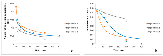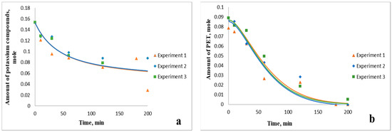 Experimental (dots) and calculated (lines) amounts of potassium compounds (a) and PET (b) at 170 °C and the initial amount of PET 0.156 mol: Experiment 1—an initial amount of FAMEs of 0.04 mole; Experiment 2—an initial amount of FAMEs of 0.07 mole; Experiment 3—an initial amount of FAMEs of 0.11 mole.