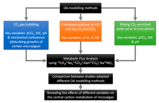 With appropriate methods to model OA and monitor the carbon chemistry of the seawater, metabolomics is a useful technique to investigate the metabolic changes of the microalgae in response to OA. This will help to reveal the biological regulation of toxin biosynthesis in microalgae under OA. Metabolomics is the investigation of a complete set of small molecules with molecular weights lower than 1500 Da, also known as the metabolome, of biological samples [141]. It has been increasingly applied in algal toxin research with technological advancements [142,143]. Metabolic flux analysis (MFA) is an effective metabolomic tool that examines the turnover rate of metabolites by using stable isotope tracers such as 13C, 2H, and 15N [144]. With the help of nuclear magnetic resonance (NMR) or mass spectrometry (MS), the isotope labeling patterns of intracellular metabolites are determined, which helps to construct a flux map, including reverse fluxes [145]. Compared to the measurement of metabolite levels, analyzing metabolic fluxes is more informative as it reveals the production and consumption rates of metabolites, which illustrate the biochemical events behind the changes in metabolite levels [146]. Based on the reviewed studies, it is hypothesized that the central carbon metabolism of toxic microalgae may be regulated differently under OA. The altered central carbon metabolism may then affect the toxicity of microalgae or relieve the stress brought by OA. Therefore, further studies on the central carbon metabolism of toxic microalgae are warranted. MFA has been applied for the investigation of photosynthesis and central carbon metabolism in microalgae, C3, and C4 plants recently in 13CO2 pulse labeling, and the distinct carbon flux pattern of microalgae has been successfully identified [147]. In this light, carbon allocation in toxic microalgae can be investigated to reveal the metabolic pathways related to toxin biosynthesis and their regulation under OA by MFA in order to elucidate the underlying mechanisms of toxicity changes. When conducting MFA to study the effects of OA on the carbon allocations of microalgae, it is critical to note that CO2 gas bubbling without the continuous control of the pH would alter the pCO2, DIC, and pH of the seawater at the same time. As a result, it is difficult to determine which confounding variable causes the observed effects. Although CO2 gas bubbling successfully mimics the carbon chemistry of seawater under OA observed in reality, this method fails to decouple different variables in the carbon chemistry to study the individual effects of the variables on the carbon allocations of microalgae. Therefore, other methods or systems that can decouple different variables of the carbon chemistry of seawater under OA should also be adopted to investigate in detail the biological mechanisms of the changes in carbon allocation of microalgae under OA when using the metabolomic approach (Figure 1) [148].