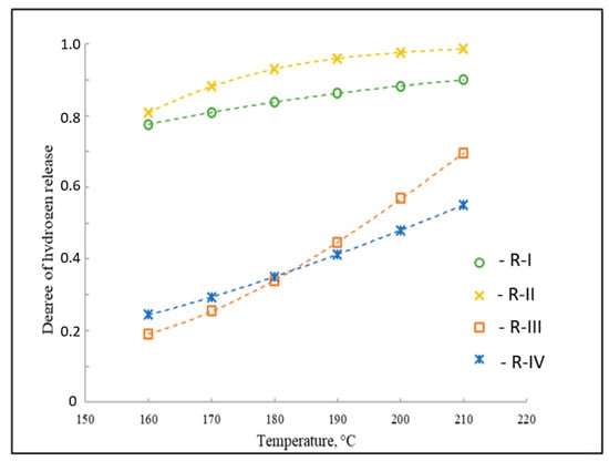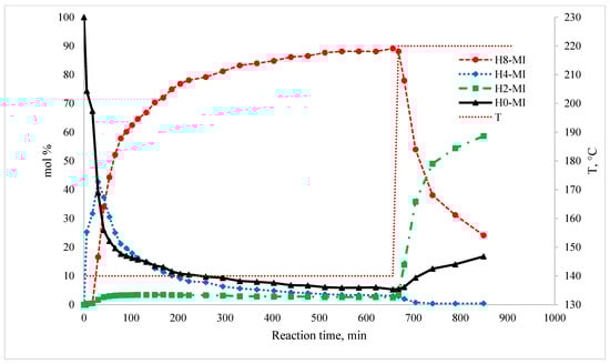 As a result of the thermodynamic analysis of the dehydrogenation in the system with H0-MI, it was found (Figure 6) that the highest degrees of H2 release at a temperature of 210 °C for the dehydrogenation reactions of H4-MI and H2-MI are equal to about 99% and 90%, respectively. For the two remaining transformations in this system, the degree of H2 release cannot exceed 70% (Figure 6). Therefore, when evaluating the possibility of using an organic molecule as a LOHC, the thermodynamic properties of all reactions taking place in the system must be taken into account, since the thermodynamics of the formation of intermediates make a significant contribution to the composition of the reaction mixture at equilibrium.