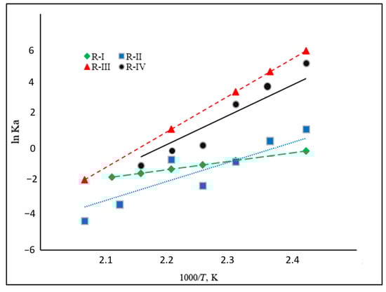 In our previous work [1], the reactants’ activity coefficients in the indole/octahydroindole system were calculated using UNIFAC methods [22]. However, it was found that under the autoclave reaction conditions applied in this work, the activity coefficients of the reactants (see Equation (3)) are not very different at a given temperature; likewise, the temperature dependence of the activity coefficients was not strong. The corresponding -products were calculated and used to derive from the experimental -values [1]. However, due to the similarity of the -values, the differences between and the experimental -values were insignificant. This observation facilitates the treatment of the equilibrium data, and in this work, it was assumed that = and the -values were used to calculate the thermodynamic functions of reactions R-I to R-IV.