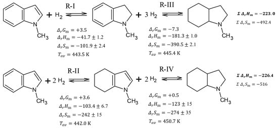 Total thermodynamic analysis of conversions in the system 1-methyl-indole/octahydro-1-methylindole. Units of and are kJ·mol−1. Units of are J·mol−1·K−1.