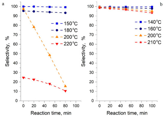 It is obvious in Figure 7 that the system based on 1-methylindole is more stable than indoline. For example, at 200 °C for 1-methylindole, the selectivity for hydrogenation reactions decreased from 99.8% to 95% for 100 min of contact, and for indoline from 99.5% to 12% for the same time of contact. As shown in Figure 7, the indole system maintains its stability at temperatures up to a range of 150–180 °C, however, above this range, rapid decomposition of all species in the reaction mixture occurs. Therefore, the maximum operating temperatures of 200 °C and 170–180 °C for 1-methylindole and indole, respectively, are recommended for practical H2 storage with this LOHC system.