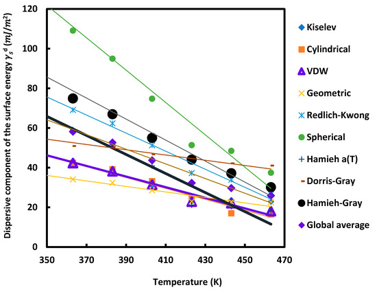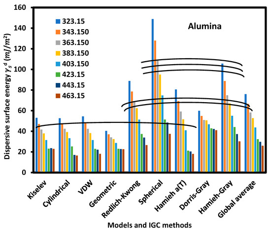 In this section, we calculated the London dispersive component of the alumina particles by using relations (3), (4), (12) and (13) and applying the various models of Van der Waals (VDW), Redlich–Kwong (R-K), Kiselev, geometric, cylindrical or spherical models [75,76,77,78,79], Dorris–Gray [69] and the thermal model [71]. In Table 5, we gave the values of the London dispersive surface energy of the alumina particles as a function of the temperature for the various methods and models.