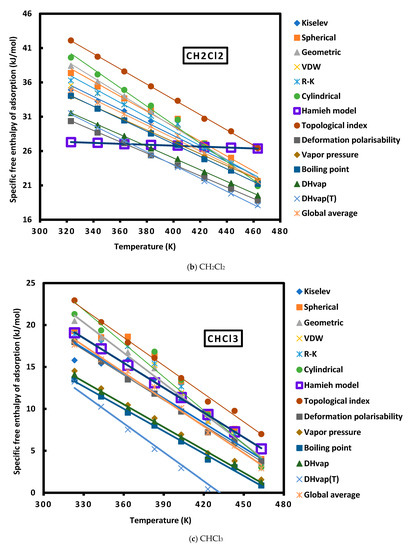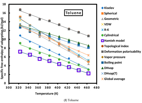 The variations of the Gibbs specific free energy () of the various polar solvents adsorbed on silica particle surface as a function of the temperature T were given in Table S1 (Supplementary Materials) for the various models, such as the Kiselev, Van der Waals, Redlich–Kwong, geometric, spherical and thermal models and IGC methods, such as the boiling point, vapor pressure, deformation polarizability, enthalpy of vaporization, , and topological index methods.