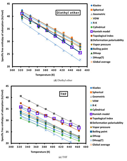 The surface areas of solvents used in the literature are those proposed by Kiselev and are the supposed constant for all temperatures. In order to prove that there are different ways to determine the surface areas of molecules depending on their geometry and their position during their adsorption on the solid surfaces, Hamieh et al. [79] proposed six new molecular models that allowed the calculation of the surface areas of organic molecules: the spherical (Sph.), geometric (Geom.), cylindric (Cyl.), Redlich–Kwong (R-K) and Van der Waals (VDW) models compared to the Kiselev results given in Table 1.