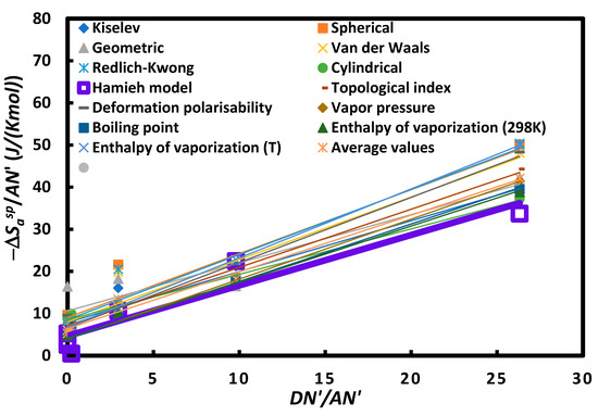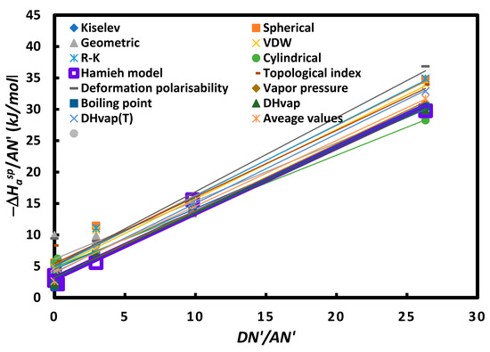 In several cases, the Gutmann method cannot be applied because the linearity of Equation (11) is not satisfied for many solid substrates. This classical relationship was corrected and a new equation was proposed by Hamieh et al. [77,81], by adding a third parameter, K, reflecting the amphoteric character of the oxide or polymer according to: