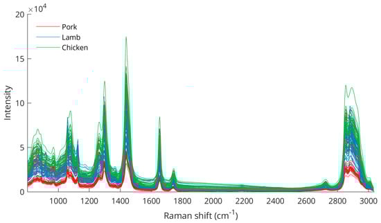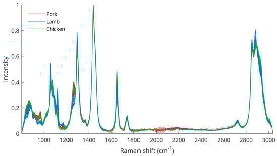 Raman spectra after spectral data preprocessing for pork, lamb, and chicken samples.