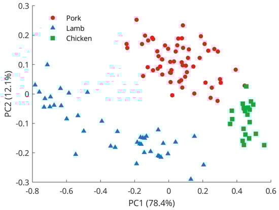 PCA scores plot revealing separation between pork, lamb, and chicken samples.