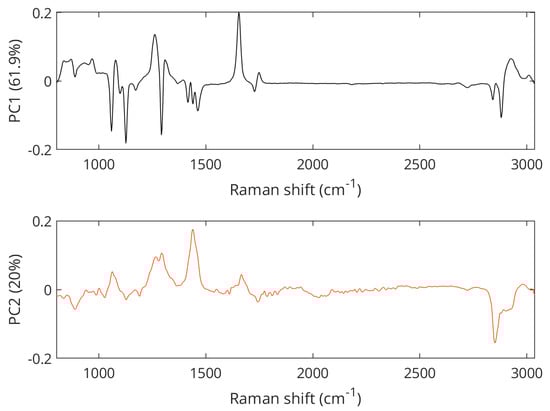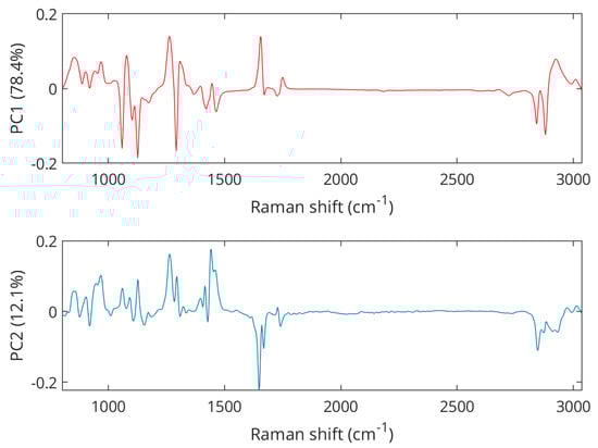 Principal Component Analysis (PCA) was used to perform an explorative analysis of the measured data []. As PCA allows for the projection of the major sources of variance in the data to a minimal and orthogonal space, it can visualize how strong the meat class differences are manifested in the Raman data in terms of component scores plots, without actively maximizing those differences. Further investigation of the component loadings can help in understanding the major variations of the data from a chemical viewpoint and helps in checking the data for artifacts and outliers. The spectral variables were centered to zero mean prior to modeling [].