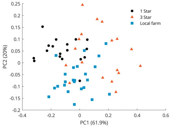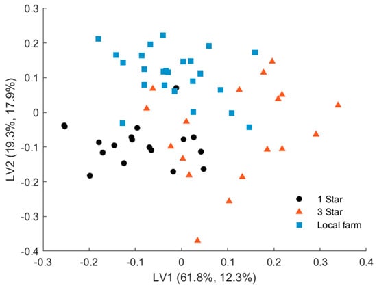 Figure 5 shows the scores for the first two principal components of a PCA model calculated on the spectral data of only the pork samples. This figure reveals that some separation between supermarket pork samples with 1-star quality mark and samples from a local farm could be recognized. Data from the 3-star quality label also referred to as biological meat did not separate well but were widely spread and occurred at high PC1 and PC2 values but also within the two clusters. Hence, only a few samples at high PC values were well separated. The large total distribution may be due to similarities in breeding conditions. For instance, living conditions and standard diets are rather similar for pigs of the supermarket quality labels 1 to 3 []. Yet, animals for biological grade meat also have access to the pasture where they can graze and forage like pigs bred on a local farm. These results show that distinguishing meats within one species based on Raman measurements is more challenging than distinguishing meats of different species, and that the usage of a supervised classifier such as PLS-DA should indeed be explored. Note that further principal components were investigated but did not reveal better class separation than is already observed for the scores of the PC1 and PC2.