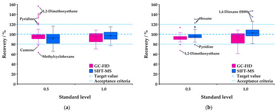 | Exceptions: methylcyclohexane 77.5%, pyridine 124.8%, 1,2-dimethoxymethane 144.6% | |||