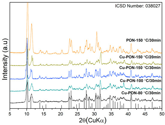 The copper content present in the synthesized materials was determined using the atomic absorption spectrometry technique (Table 1). Among the materials, the one synthesized at 150 °C for 20 min showed a lower Cu content in its structure of approximately 7.0%.