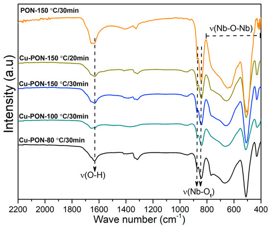 Then, this solution was heated to 80 °C under constant stirring until complete dissolution of the precursors, and 50 mL of aqueous NaOH 1 M solution was added. The pH of the solution was adjusted by adding NaOH 5 M up to pH 14. The formed precipitate was transferred to a 100 mL polytetrafluoroethylene capsule in a microwave reactor. Microwave-assisted hydrothermal-treatment temperatures ranged from 80 to 150 °C for 20 and 30 min. After treatment, the solution was cooled to room temperature, centrifuged, washed with H2O, and dried in an oven at 60 °C for 12 h. The samples were conveniently named according to the time and temperature of the microwave-assisted hydrothermal treatment. The materials treated for 20 and 30 min at 150 °C were called Cu-PON-150 °C/20 min and Cu-PON-150 °C/30 min, respectively, and the materials treated for 30 min at 80 and 100 °C were called Cu-PON-80 °C/30 min and Cu-PON-100 °C/30 min, respectively. The polyoxoniobate without Cu+2 modification was prepared with the same experimental procedure, only excluding the Cu(NO3)2.3H2O addition step. In this case, the material was heat-treated at 150 °C for 30 min and called PON-150 °C/30 min.