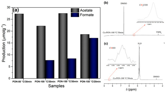 Products formed in the liquid medium during the CO2 photoreduction process after 5 h of reaction under UV radiation (a), and the NMR spectrum of the products with Cu-PON-100 °C/30 min: (b) acetate, and (c) formate. Insets in figures (b,c) show an enlarged view of the spectrum.