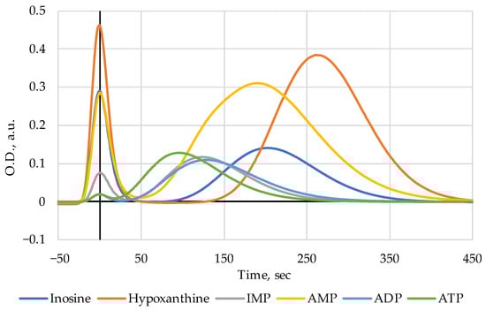 The FPMLC sensor was calibrated with model solutions of bovine serum albumin (BSA, heat shock fraction, pH 7, ≥98%, Product No. A7906) and the main nutritional nucleotides and nucleosides, i.e., ATP (disodium salt hydrate, Grade II, ≥97% HPLC, from microbial, Product No. A3377), ADP (sodium salt; >95% HPLC, bacterial, Product No. A2754), AMP (sodium salt, from yeast, ≥99%, Product No. A1752), IMP (disodium salt hydrate, ≥99.0% HPLC, Product No. 57510), inosine (Ino, ≥99% HPLC, Product No. I4125), and hypoxanthine (Hx, ≥99.0%, Product No. H9377) in TRIS buffer (pH 8.0) []; the BSA, the nucleotides, and the nucleoside standards were purchased from Sigma-Aldrich, Burlington, MA, USA. The FPMLC chromatograms of ATP, ADP, AMP, IMP, Ino, and Hx are presented in Figure 1; BSA solution was added to all samples to produce a highly distinctive reference protein peak. The timescale of the chromatograms was adjusted in such a way that the BSA peak is at point zero. The elution times of the nucleotides and nucleosides are presented in Table 2 the values were determined relative to the BSA peak. The higher elution times are characteristic of the lower molecular weight substances (Ino and Hx) which emerge at the later stages of the ATP breakdown chain [].