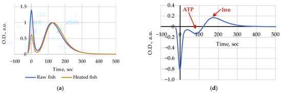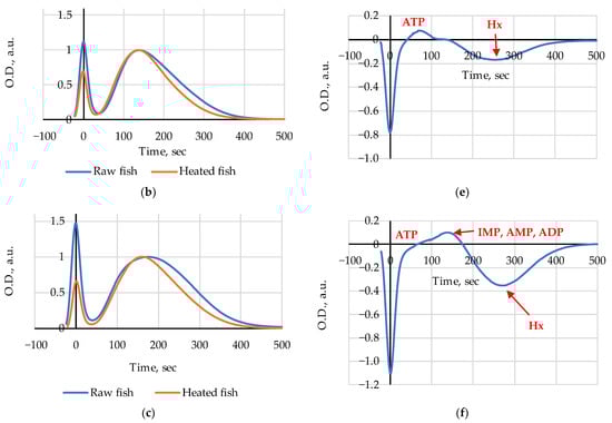 In the difference chromatograms (Heated–Raw), special attention should be given to the interval of elution times below 300 s which are characteristic for all nucleotides and nucleosides relevant for the current research []. The amplitude and the sign of peaks indicate heat-induced emergence or disappearance and changes in the relative concentrations of substances in fish extracts. Following this assumption, it is reasonable to conclude that a decrease in ATP and possibly ADP content (a negative peak at 80–100 s) and an increase in Ino (a positive peak at 180–200 s) are clearly discernible on day 1 (Figure 2d); on day 5 (Figure 2e) we see a slight increase in ATP and possibly ADP content (a positive peak at 80–100 s) and a relative decrease in the Hx level (a negative peak at 250–270 s); on day 8 (Figure 2f) an increase in ATP (a small positive peak at 90–100 s), IMP, ADP, and AMP (a wide positive peak at 120–170 s) and also a relative decrease in the Hx level (a negative peak at 250–270 s) are visible as the results of heating in water steam are noticeable.