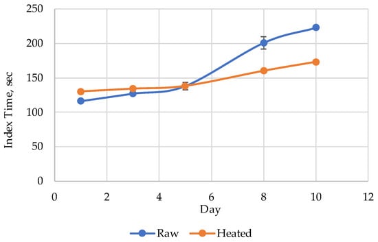 The index Time evolution for the raw and heated Amur during the 10 days’ storage period is presented in Figure 3. The index Time values for the heated (steamed) Amur were slightly higher than those for the raw samples on days 1 and 3 (Figure 2a and Figure 3). After day 5 (Figure 2b and Figure 3), the initial index Time value before heat treatment became higher than after steam cooking (Figure 2c and Figure 3).