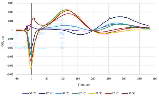 The decrease in the index Time after heat treatment of Amur on day 10 (50 s) is the largest observed by us so far, indirectly indicating strong effects of nucleotide salvage. Nevertheless, to continue the experiments, we worked with pollock. Its rather unique characteristic was the complete absence of nucleotides in the initial raw state, which made it easy to detect even the slightest changes induced by heat. The difference of the two chromatograms (Boiled–Raw) for Alaska pollock samples heated in broth at various temperatures are presented in Figure 4.