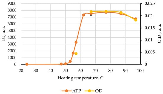 The results of the ATP test (LU) and the amplitude of the characteristic peak at 120 s in the difference chromatograms (O.D.) of Alaska pollack samples heated in broth at different temperatures.