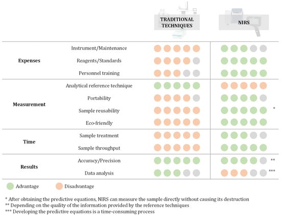 One of the main common disadvantages of all the aforementioned techniques, is the employment of expensive equipment that require expertise personnel as well as reactants and solvents. In this context, near-infrared spectroscopy (NIRS) has been gaining much attention in the last decade due to its multiple advantages (Figure 1). On the one hand, its broad spectral range facilitates the detection and quantification of numerous compounds or properties in complex mixtures without the need for extensive separation methods. Additionally, it is a low-cost and rapid technique that can provide results within a few minutes, which is especially useful for high-throughput analysis or applications where quick results are required [42]. Since it is a non-destructive technique, samples can be used after NIRS measurements for other applications [36,43], which is particularly advantageous when working with valuable or limited sample quantities [44]. On the other hand, its versatility allows broad application across various sample types, including solids, liquids, and gases, being particularly adept at simultaneous analysis of multiple components within a sample [45]. Nowadays, with the development of portable NIRS instruments, measurements can be performed in situ, and consequently, sample treatment is either entirely or almost entirely avoided [42]. Therefore, NIRS is truly in line with the green analytical chemistry principles, i.e., diminishing the utilization of hazardous chemicals and reagents, employing equipment that is energy-efficient, and producing minimal waste [46]. However, the main drawback of NIRS technology is the interpretation of the spectra, which is difficult, and the use of mathematical and statistical methods, i.e., chemometrics, is mandatory to extract the important information related to chemical mechanisms [47,48].