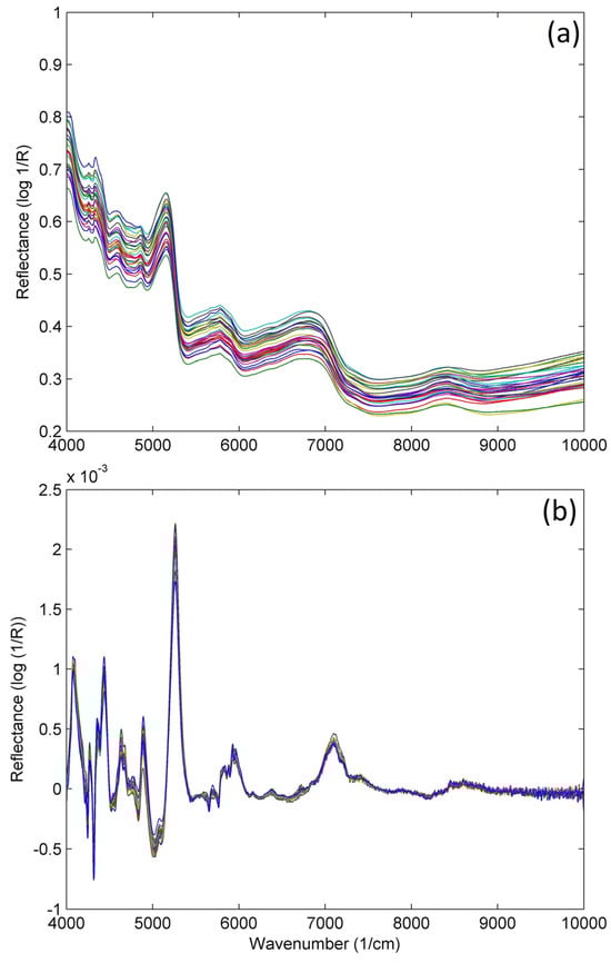 NIR spectra of Cannabis samples (a) raw spectra and (b) spectra after preprocessing (smoothing, MSC, first derivative, and mean-centered). Reproduced from reference [51] with permission from Elsevier, copyright 2016.
