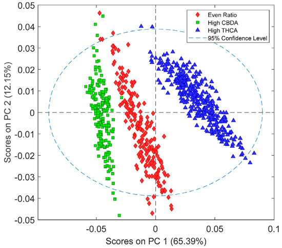 Relatedly, Tran et al. [42] developed prediction models using two different NIRS instruments, i.e., benchtop and handheld, for the quantification of cannabinoids in Cannabis samples. Before quantitative method development, they applied different preprocessing techniques and PCA to take an overview of the classification of the data. As can be seen in Figure 3, PCA revealed three well-defined classes depending on the cannabinoid content, i.e., high CBDA, high THCA, and even ratio, for the benchtop instrument, thus showing the potential of this technique to preliminary classification of samples.