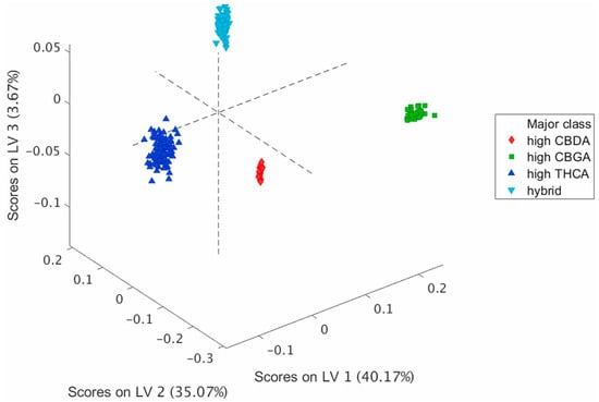 There are several articles in which this technique is employed so as to take an overlook of the data that are going to be subsequently fitted into a quantitative method or to develop very accurate qualitative methods for the classification of Cannabis samples [20,42,69,70]. For instance, Birenboim et al. [20] developed a method for the classification of Cannabis cultivars and the quantification of major cannabinoids and terpenes via Fourier transform near-infrared spectroscopy (FT-NIR) combined with chemometrics. Prior development of the quantitative method, multivariate classification and regression models were used, e.g., PLS-DA. This technique was particularly useful for major class separation of the samples in four categories, namely high-THC, high-CBD, hybrid, and high-CBG, for which the FT-NIR spectra of the ground inflorescence samples were employed, as observed in Figure 4. The results showed no misclassified samples, with sensitivity and specificity values of 1, which ensures that the classification model is highly accurate. Furthermore, the root mean standard error of cross validation (RMSECV) and calibration (RMSEC) ratio, along with the root mean standard error of prediction (RMSEP) and the RMSECV ratio, were both below 1.5, thus indicating a low probability of model overfitting to the data.