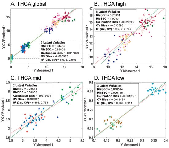Correlation between the predicted values of THCA (y-axis) via PLS-R and the references values (x-axis) provided through HPLC-DAD at global (A), high (B), mid (C) and low (D) concentration. Colours and shapes correspond to the different strains employed for calibration. Adapted from reference [20] with permission from Elsevier, copyright 2022.