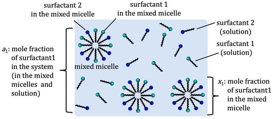 - Huang, L.; Somasundaran, P. Changes in Micelle Compositions and Monomer Concentrations in Mixed Surfactant Solutions. Langmuir 1996, 12, 5790–5795. [Google Scholar] [CrossRef]
