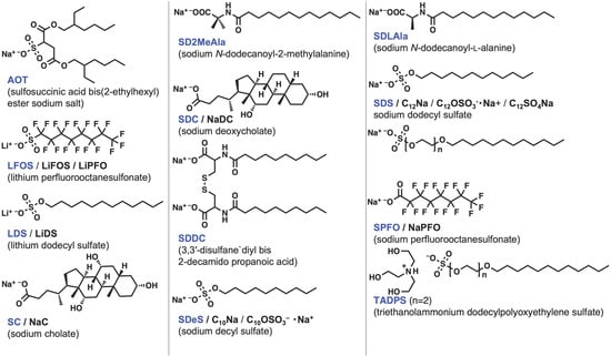 - Treiner, C.; Vaution, C.; Miralles, E.; Puisieux, F. Influence of Sodium Dodecylsulfate and of Inorganic Electrolytes on the Micellar Solubilization of Butobarbitone in Aqueous Polyoxyethylene Lauryl Ether Solutions at 298.15 K. Colloids Surf. 1985, 14, 285–292. [Google Scholar] [CrossRef]
