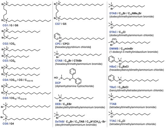 - Rodríguez, J.L.; Minardi, R.M.; Schulz, E.P.; Pieroni, O.; Schulz, P.C. The Composition of Mixed Micelles Formed by Dodecyl Trimethyl Ammonium Bromide and Benzethonium Chloride in Water. J. Surfactants Deterg. 2011, 15, 147–155. [Google Scholar] [CrossRef]