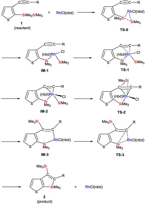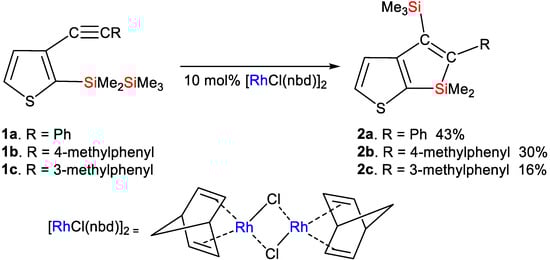 Reaction of Compound 6 in the Presence of [RhCl(nbd)2]2 Catalyst: In a 30 mL two-necked flask equipped with a reflux condenser, compound 6 (0.110 g, 0.345 mmol) and 0.016 g (0.0347 mmol) of [RhCl(nbd)2]2 were introduced into dry toluene (1.5 mL). The resulting mixture was heated under reflux for 1 h. Post-reflux, distilled water was added to the mixture, leading to the separation of the organic layer, which was subsequently washed with water and dried using anhydrous magnesium sulfate. Evaporation of the solvent followed, and the remaining residue underwent chromatography on a silica gel column, being eluted with hexane. Compound 6 was consumed in the reaction; however, multiple products were detected in the reaction mixture via gas–liquid chromatography (GLC) and gel permeation chromatography (GPC). No derivatives of thiophene-fused silole were identified in the reaction mixture.