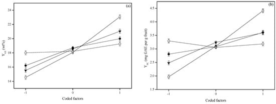 According to Table 3, all linear terms affected the responses and in general, quadratic terms had less impact than linear terms, except for X3. The interactive effects affected responses in different ways, as described in the following topics. Figure 1 presents the main effects of the investigated variables on the response variables, in which each of the factors was shifted from its lowest level (−1) to its highest level (1). It is possible to verify that the temperature presented a greater linear relationship (slope) with YGE and YPC in comparison with the other variables, indicating that higher values of the responses are obtained as the variable increases. On the other hand, the sample to solvent ratio had less effect on the investigated variables, since the line for this parameter was close to the horizontal.
