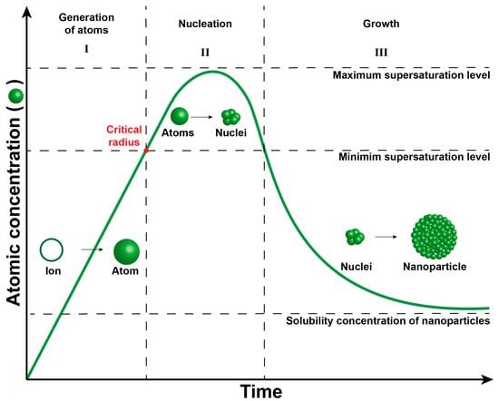 In this context, the properties of nanoparticles—such as size, shape, and structure—are intricately linked [15]. The crucial aspect in achieving monodisperse and uniform nanoparticles lies in effectively segregating the nucleation and growth processes. The LaMer plot elucidates the nanoparticle formation phenomenon (Figure 2), encompassing three distinct stages: (i) generation of atoms, (ii) nucleation, and (iii) growth [16,17,18,19].
