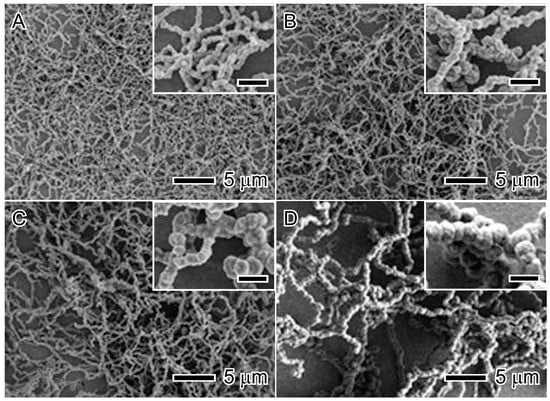 Influence of precursor concentration on the chain-like nanostructured material size: 5 mM (A), 10 mM (B), 20 mM (C), and 50 mM (D). Scale bars in inset images represent 500 nm. Reproduced with permission from [33], Royal Society of Chemistry, 2012.
