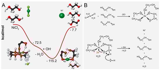 The plot of the calculated change in energy (A) and reaction mechanism of Ni2+ reduction by the ethylene glycol (B). Reproduced with permission from [51], American Chemical Society Publications, 2011.
