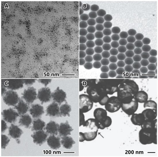 Reducing agents: sodium borohydride in polyol method (A), aqueous solution (B), sodium hypophosphite produced in bulk nanoparticles (C), and hollow nanoparticles (D), where arrow points to a broken hollow nanoparticle. The image (A) is reproduced with permission from [56], Elsevier, 2007. The image (B) is reproduced with permission from [25], American Chemical Society Publications, 2009. The image (C) is reproduced with permission from [74], Elsevier, 2010. The image (D) is reproduced with permission from [30], John Wiley and Sons, 2003.