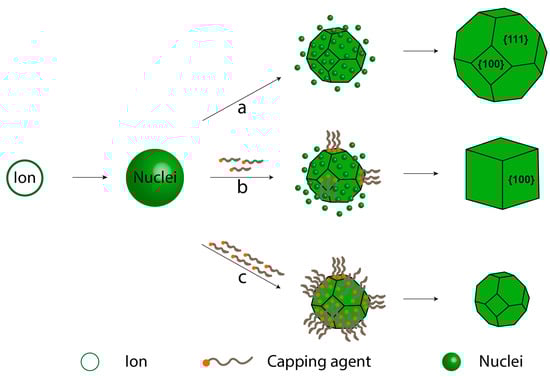 Stabilizing agents can take the form of additives, including organic molecules, polymers, or surfactants, as well as ions, such as counterions of precursors that bind to specific crystalline surfaces. These agents play a crucial role in steric stabilization, protecting against uncontrolled growth. However, it is important to note that the exposed plane tends to grow when the surface is stabilized, as illustrated in Figure 7 [48,49]. This phenomenon is rooted in nucleation and growth theory, as depicted by the LaMer curve [50]. In this theory, a crystal is an ion that undergoes reduction to produce metallic atoms, promoting their aggregation to form small nuclei through self-nucleation [51]. As a result, the concentration of atoms decreases while the cluster concentration increases, leading to an increase in nuclei size, ultimately forming tiny crystals. The role of the stabilizing agent is crucial for controlling the shape and/or size because the crystalline surface is well defined, and the stabilizing agent can perform more efficiently. In Figure 7a, crystal growth without a stabilizing agent is shown, where the nuclei are incorporated onto all crystal surfaces, resulting in uniform growth. In Figure 7b, a moderate amount of stabilizing agent is used to control the synthesis to form a cube. In this example, the exposed planes are (111) and (100), and the stabilizing agent preferentially interacts with the (100) plane, inhibiting its growth. As a result, the exposed (111) plane grows easily until the desired surface is achieved. In Figure 7c, an excessive amount of stabilizing agent is employed, fixing, and protecting all exposed surfaces. This inhibits crystal growth, leading to the formation of smaller particles.