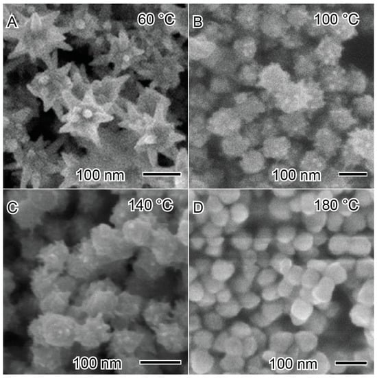 As an example of the influence of temperature on the synthesis of nickel nanoparticles, Bai et al. reported the synthesis of nickel nanoparticles at different temperatures to produce nanostars and nanospheres, as depicted in Figure 9 [98]. The nickel nanoparticles were synthesized using a solvothermal method with ethanol as a solvent, hydrazine as a reducing agent, and NaOH to increase the reduction potential of the reducing agent. The synthetic methodology naturally presents high kinetic conditions. At lower temperatures (60 °C), nanostars with well-defined pronounced arms were produced. At 60 °C (Figure 9A), the reaction medium exhibits a lower degree of freedom of mobility of growth species, which are anchored in the first site with higher energy to grow the arms. However, after increasing the temperature to elevated values, such as 100 °C (Figure 9B) and 140 °C (Figure 9C), the spikes become smaller and with lower definition, forming a spherical morphology at 180 °C (Figure 9D). This indicates that the degree of freedom of the reaction is increasing, and the growth species can have greater mobility on the nanostructured material surface to minimize the free energy of the system [62,98].