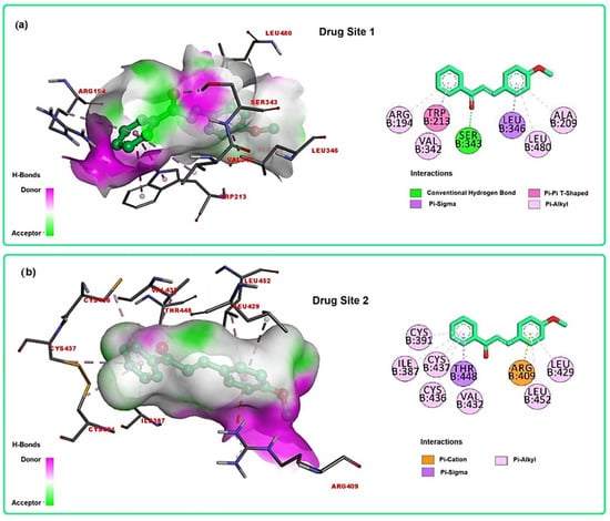 For Drug Site 1, MPP showed binding energy equal to −8.5 kcal/mol for the higher score conformation, while naproxen, the co-crystallized ligand, presented binding energy equal to −9.0 kcal/mol. Binding mode analysis showed that MPP complexed to Drug Site 1 (Figure 3a) by H-bond interaction with Ser 343, π-sigma with Leu 346, π-π (T-Shaped) with Trp 213 and π-alkyl interactions with Arg 194, Val 342, Leu 480 and Ala 209. For Drug Site 2, MPP showed binding energy equal to −7.5 kcal/mol for the higher score conformation, while naproxen presented binding energy equal to −8.9 kcal/mol. Binding mode analysis revealed that MPP complexed to Drug Site 2 (Figure 3b) by π-cation interaction with Arg 409, π-sigma with Thr 448 and π-alkyl interactions with Arg 194, Val 342, Leu 480 and Ala 209. Although the molecule showed negative binding values for both sites, Drug Site 1 seems to better accommodate the molecule under study, as the docking simulations revealed a more negative value for MPP at this site (−8.5 kcal/mol). Furthermore, despite the interactions being predominantly non-polar in both sites, in Drug Site 1, a strong H-bond is formed, followed by π-π (T-Shaped) interaction, indicating more stability for the BSA-MPP complex when MPP binds to Drug Site 1. Moreover, the size of Drug Site 1 contributes to better allocation of the molecule, as this site is larger than Drug Site 2 and thus favors better interactions. The binding mechanism of chalcone to bovine serum albumin (BSA) has been widely explored by computational and spectroscopic methods. This protein affinity is directly linked to the distribution and half-life of chalcones [52,53].