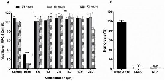 (A) Cell viability of the untreated control group, positive control doxorubicin at 20 µM (doxo) and MPP at different concentrations per period of 24, 48 and 72 h in MRC-5 cell line; (B) hemolytic activity of MPP at the concentration of 20 µM compared to the standard triton X-100. Results are shown as the mean ± standard deviation (n = 3). **** p < 0.0001. ns = not significant (p > 0.05) vs. untreated control group; ** p < 0.01 (ANOVA followed by Dunnett’s multiple comparisons test).