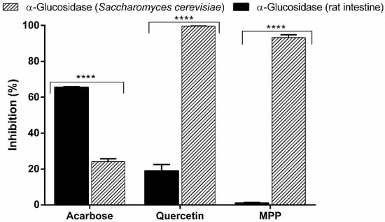 Inhibitory activity of acarbose, quercetin and MPP at the concentration 100 µg mL−1 on the enzymes of α-glucosidase extracted from Saccharomyces cerevisiae and α -glucosidase extracted from rat intestinal acetone powders. The results are expressed as mean ± SD, n = 3. **** p < 0.0001 (ANOVA followed by Dunnett’s multiple comparisons test).